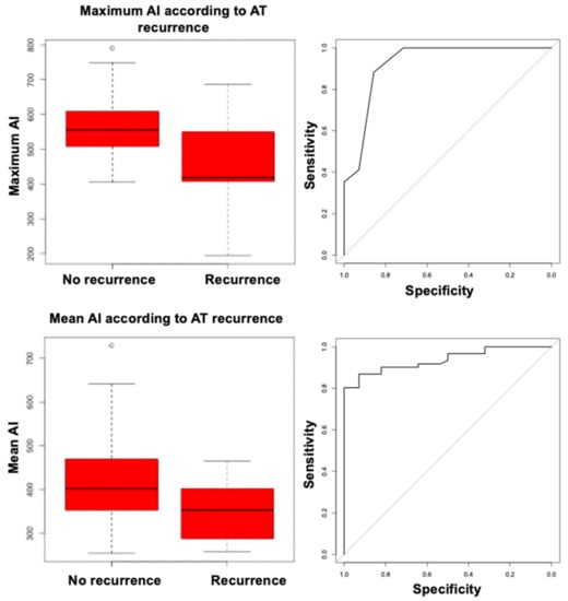 In order to retrospectively identify the optimal AI cutoff associated with AT recurrences, we performed receiver operating characteristic (ROC) curve analysis, and found that both maximum AI and mean AI had good discrimination ability for recurrent AT, with areas under the ROC curve (AUC) of 0.92 (95% CI, 0.85–1.00) and 0.94 (95% CI, 0.89–0.98), respectively (Figure 5); discrimination ability was statistically similar (DeLong test’s p = 0.74).