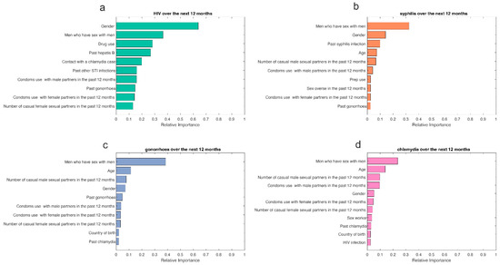 Variable importance analysis for predicting (a) HIV, (b) syphilis, (c) gonorrhoea, and (d) chlamydia over the next 12 months.