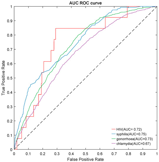Of the 17 models, the receiver operating characteristic (ROC) curve that showed the best prediction models for HIV was the Boosted GLM (AUC = 0.73), for syphilis was the Boosted GLM (AUC = 0.76), for gonorrhoea was the ensemble Elastic-Net Regression (ENR)+ Gradient Boosting Machines (GBM)+ Random Forest (RF) (AUC = 0.73), and for chlamydia was the ensemble ENR+GBM+RF (AUC = 0.67). Details of the model-evaluation metrics are shown in the Tables S4–S19.