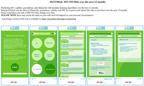 To estimate the risk of twelve-month HIV/STIs, we fitted the data using a logistic function to provide a fitting curve for each model-predicted probability and infection prevalence (see Figures S2–S5). Details are shown in the Supplementary Materials. Our machine learning models were translated into a risk-prediction tool for predicting HIV/STIs. Our machine-learning-based risk-prediction tool was developed as a web application using the Shiny R package that creates the web-based tool named MySTIRisk. A prototype version of the tool is available at https://ystirisk.shinyapps.io/mystirisk, accessed on 1 March 2022. Figure 3 shows our proposed design for the user interface. The user interface has five modules: (1) the questionnaire survey module, (2) data-processing module, (3) HIV/STI risk prediction over the next 12 months, (4) testing recommendations, and (5) suggestions for risk reduction (Figure 3). Details are provided in the Supplementary File.