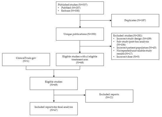 A systematic literature review was performed according to the Preferred Reporting Items for Systematic Reviews and Meta-Analyses (PRISMA) guidelines and the Cochrane Collaboration statement [18,19]. We looked for studies using a sensitive search strategy pertaining to anti-VEGF agents used in AMD management in the PubMed/Medline®, Embase® (access via Ovid platform) and Cochrane CENTRAL databases from the earliest available time up to 16 March 2020. Moreover, studies from ClinicalTrial.gov (accessed on 15 March 2022). with detailed results that had not been published elsewhere were retrieved, as well. The individual search terms applied for the searches are listed in Table 1. The selection of search terms was based on a two-expert consultation. Studies from PubMed were limited to “clinical trials” and “human” studies, with animal and basic science studies being excluded from the analysis, whereas studies from ClinicalTrials.gov were limited to those that were either “terminated” or “completed”. After the database search, two of the authors of this review independently selected articles, and selection was followed by a double-check and validation process. The manual selection process for eligible publications comprised a review of the titles and abstracts; studies that did not match the previously established criteria were excluded. Next, the abstracts and full texts of the retrieved publications were read by the authors in full, thereby confirming their eligibility. The selected publications reported results of prospective, randomized controlled studies related to exudative nAMD and its synonyms and acronyms. The Cochrane risk of bias tool was applied to further assess the quality of the included studies. All of the selected studies had at least one treatment arm involving first-line treatment, thus involving treatment-naïve patients undergoing first-line treatment with one of the following agents: aflibercept 2 mg, ranibizumab 0.5 mg, bevacizumab 1.25 mg, brolucizumab 6mg or abicipar pegol 2 mg. Phase 1 studies, in addition to subgroup or post hoc analyses, were excluded. Moreover, to meet the eligibility criteria, these studies needed to include primary or secondary outcome measures assessing the best-corrected visual acuity (BCVA) and BCVA at ≥12 months after the baseline. In contrast, studies involving previously treated patients and those with a follow-up duration of <12 months or >24 months without any available intermediate data were not considered. Based on these criteria, a total of 69 studies were retrieved.