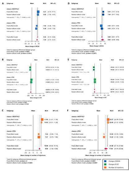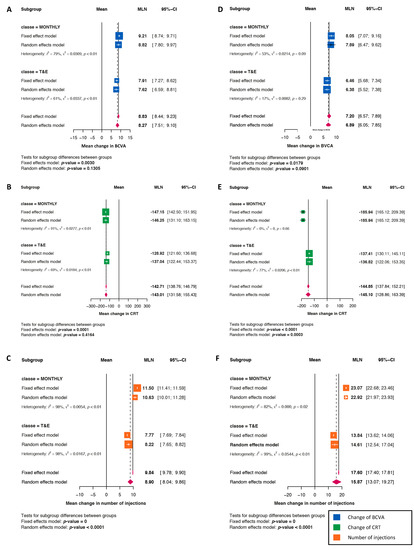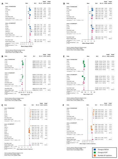 Studies were assessed for clinical and methodological heterogeneity and for the risk of bias, as well as to determine their suitability for inclusion in the model. Single-means modeling based on fixed- and random-effect models and heterogeneity tests were applied to compare the anti-VEGF regimens, as well as agents within the same regimen. Next, “2 to 2” modeling was applied to further refine the comparisons of various anti-VEGF regimens and agents, aiming to retain the most relevant and robust data. A meta-analysis of the data was conducted to compare the study arms. All of the study arms with means, standard deviations and counts were entered into the model to attain significant statistical power. Intra-study comparisons between randomized study arms were not carried out. Visual outcome data were analyzed following conversion into ETDRS letters if not already available, similar to in [22].