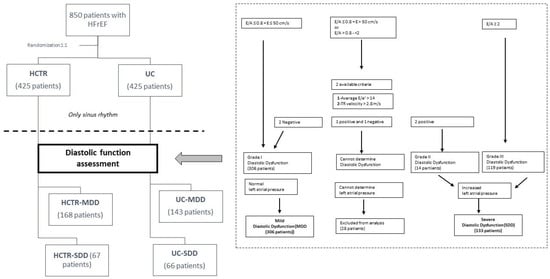 Among patients assigned to the HCTR group with sinus rhythm, 168 patients had mild diastolic dysfunction (HCTR-MDD) and 67 patients had severe diastolic dysfunction (HCTR-SDD). Among patients assigned to the UC group with sinus rhythm, 143 patients had mild diastolic dysfunction (UC-MDD) and 66 patients had severe diastolic dysfunction (UC-SDD). On Figure 1, diastolic dysfunction criteria and groups are presented.