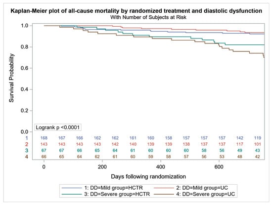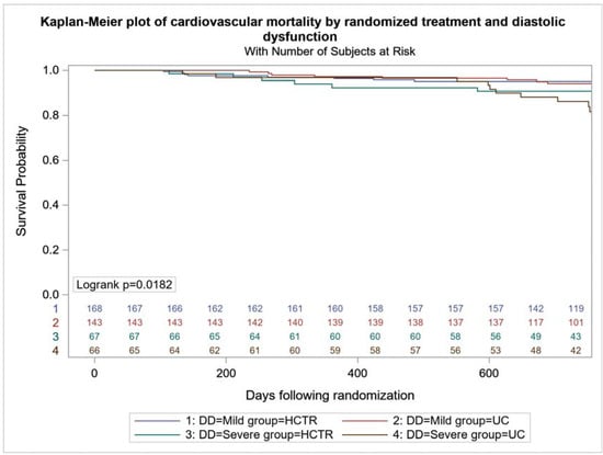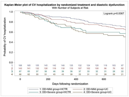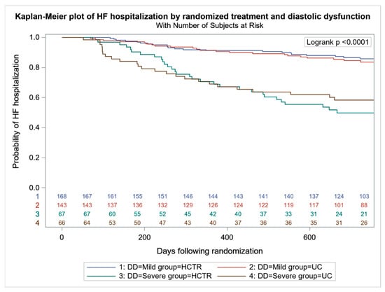 All-cause mortality was higher in UC-SDD vs. UC-MDD (24 (36.4%) vs. 42 (29.4%), p < 0.001), with no difference between HCTR-SDD and HCTR-MDD (24 (35.8%) vs. 49 (29.2%), p = 0.064) (Figure 2). No difference in the probability of CV mortality and hospitalization were found in HCTR and UC groups (Figure 3 and Figure 4). The probability of CV hospitalization was not associated with diastolic dysfunction. A higher probability of HF hospitalization (Figure 5) was seen in HCTR-SDD compared to HCTR-MDD (46 (68.6%) vs. 65 (38.7%), p < 0.001, retrospectively) and in UC-SDD compared to UC-MDD (40 (60.6%) vs. 55 (38.5%), p < 0.001, retrospectively).