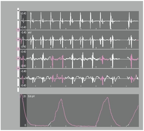 Reliable positioning of the NAVA catheter is necessary to trace a representative EAdi signal and therefore deliver a reliable input for ventilator assistance. The optimal catheter position was defined by the stability of the EAdi signal, diaphragm electrical activity highlighted in the two central ECG leads of the catheter positioning tool during inspiration and the absence of p-wave on ECG in distal lead (Figure 2) [59]. These indications are based upon investigations where an accurate diaphragmatic activity was detected as an electromyographic signal from the catheter central electrodes highest in central frequency and reduced in root mean square [63]. In fact, when the signal is derived from central leads of the electrode array it is more efficient, preventing loss of the electromyographic input caused by diaphragm displacement along the respiratory cycle.