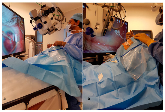 The surgical chair was lowered as much as possible, to ensure that the patient’s eye was located at about the generator cassette level. Depending on the angle at which the patient was tilted, the microscope was tilted such that it was parallel to the eye and its optical axis was perpendicular to the surgical plane, providing good visualization (Figure 1).