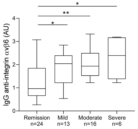 IgG anti-integrin αvβ6 autoantibody concentration vs. ulcerative colitis disease severity according to the partial Mayo score. Significant differences between the severity groups are indicated (* p < 0.05, ** p < 0.01).