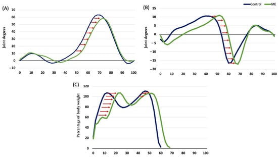 (A) Timing of the knee kinematics; (B) Timing of the ankle kinematics; (C) Timing of the vertical ground reaction forces. (A–C) x-axis is percentage of the gait cycle. (A,B) y-axis is joint degrees. (C) y-axis is percentage of body weight. The blue line is the control group; the green line is the MS group.