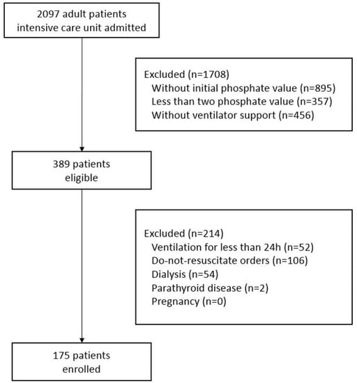 - Miller, C.J.; Doepker, B.A.; Springer, A.N.; Exline, M.C.; Phillips, G.; Murphy, C.V. Impact of serum phosphate in mechanically ventilated patients with severe sepsis and septic shock. J. Intensive Care Med. 2020, 35, 485–493. [Google Scholar] [CrossRef] [PubMed]
