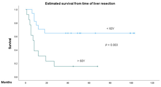 Statistical analysis was performed using SPSS (V. XX, IBM, Armonk, New York, NY, USA). Data were described as the mean and standard deviation or median and range. Paired and unpaired Student’s t-tests were carried out for comparison of parameters, as appropriate. For multivariate analysis and group comparison, log-rank and Cox regression analyses were performed. Overall survival (OS) was calculated from the day of surgery to death or last follow-up. Recurrence-free survival (RFS) was calculated from the day of surgery to the first diagnosis of recurrence if radical resection of the liver and extrahepatic manifestations were initially achieved. Analyses of OS and RFS were obtained by using the Kaplan–Meier method. A p-value < 0.05 was considered statistically significant.