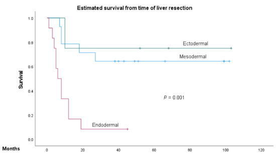 In our cohort, the liver resection of the metastasis of tumors with endodermal origin showed a significantly worse prognosis. The sample size would not allow the comparison of all the entities. However, i.e., the liver metastases of pancreatic adenocarcinoma were only solitary tumors. In one patient, the resection of the metastasis was conducted simultaneously during the primary operation for pancreatic cancer. Three patients underwent hepatic surgery following primary pancreas surgery and additive chemotherapy. Recently, Shao et al. showed the feasibility of simultaneous pancreas and liver resection in the oligometastatic concept due to pancreatic cancer, and it showed a significant benefit for the patients following resection and (neo)adjuvant chemotherapy and surgery in comparison to patients that underwent palliative regimens only [34]. Although they included nine patients without neoadjuvant chemotherapy due to the intraoperative diagnosis of liver lesions, they favored chemotherapy for oligometastatic diseases. We also propose that the NCRNELM should be rapidly evaluated for aggressive systemic therapy, since there are encouraging steps in the oncological treatment of, especially, pancreatic [33], esophageal, gastric [35], and renal cell cancer [36]. Taking all these developments into consideration, it is more likely that more patients with liver metastasis of NCRNNE could be candidates for hepatic resection.