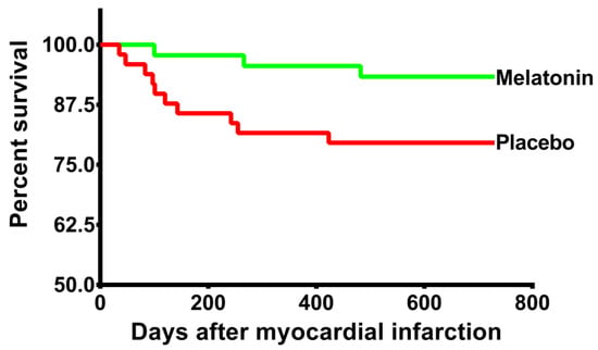 AMI is one of the biggest challenges for the health systems of western countries. Survival from myocardial infarction has improved considerably because of early, effective treatment, but myocardial infarction leads to chronic heart failure in many cases, exerting a huge global healthcare burden on a country’s economic resources. Despite timely reperfusion with primary percutaneous coronary intervention, mortality and morbidity following AMI remain significant, with 7% death and 22% hospitalization for heart failure at one year []. The social impact of ischemic heart disease is enormous, not just because of the resulting mortality, but also because of lower quality of life and the high economic costs involved. New cardioprotective strategies are needed to attenuate the damaging effects of IRI and thereby prevent adverse left ventricular remodeling, improve survival and reduce heart failure []. Our study showed at 2 years of follow-up that patients treated with melatonin lived without hospital admission for heart failure, on average, 90 days longer than those treated with placebo.