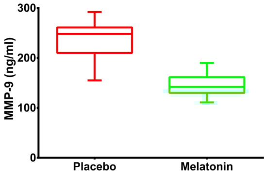 Compared with the placebo, MMP-9 levels were reduced in the melatonin group (248 ng/mL (211–259) vs. 142 ng/mL (130–161) p < 0.001). The distribution of this molecule between groups can be observed in Figure 3. After controlling for weight, hemoglobin and number of diseased coronary vessels, the treatment with melatonin reduced the levels of MMP-9 to 90 ng/mL (95% CI 77.3–102.6).