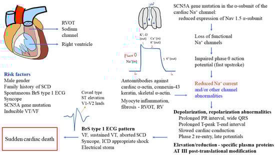 A recent study identified autoantibodies in the myocardium of BrS patients against cardiac proteins (α-actin, skeletal α-actin, connexin-43, keratin) and observed abnormal expression of Nav1.5 α-subunit proteins []. Another study reported distinct elevation (apolipoprotein E, clusterin, prothrombin, vitamin-D-binding protein, complement-factor H, voltage-dependent anion-selective channel protein 3, vitronectin) or reduction (alpha-1-antitrypsin, angiotensinogen, fibrinogen) in plasma proteome of BrS patients and relatives with SCN5AQ1118X gene mutation compared to their healthy family members without the gene mutation, as well as antithrombin-III post-translational modifications []. Figure 1 displays an overview of the pathomechanism processes in BrS.