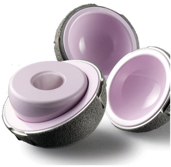 In the 1970s, Professor Giles Bousquet, introduced the DM design. It incorporated both Charnley’s ‘low friction’ and McKnee–Farrar’s stability through the use large head principles [,]. DM design consists of a small articulation between the small femoral head (22 or 28 mm) captive and mobile within a polyethylene (PE) Liner (Figure 3) and a larger articulation between the PE liner ball with a highly polished metallic acetabular shell. The PE large head diameter is usually 6–8 mm smaller than the size of the outer metallic shell. Most of the movement occurs at the small articulation. Movement of the large articulation only happens when the stem’s neck comes into contact with the PE head. This design has two articulations (femoral head-PE liner, PE liner–outer shell) and three interfaces (small and larger bearing and neck-polyethylene contact point). Wear can occur at the two bearing surfaces and the taper junction. Particles produced (PE or metal) are dependent on the surfaces interacting.
