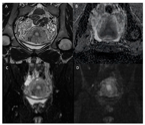 DWI represented a breakthrough in oncological imaging, including prostate imaging [43,44]. It now constitutes the cornerstone of prostate cancer imaging which is realized by multi-parametric MRI (mpMRI) [45]. The “multi-parametric” perspective corresponds to three sequences acquired in a single MRI session. It first includes the anatomical T2W sequence depicting the prostatic zonal architecture in at least two different planes, primarily in the axial and secondly in the sagittal and/or the coronal planes by using high resolution images. Then, two functional sequences are acquired in the axial plane. The considered DW sequence is performed prior to contrast administration and followed by DCE imaging, which is sometimes referred to as perfusion imaging. It has to be noted that the latter requires intravenous gadolinium contrast injection at a high flow rate. When no dynamic contrast-enhanced imaging is performed, the pair of T2W and DW sequences is referred to as bi-parametric MRI (bpMRI). BpMRI corresponds to the minimal standard of a contributive examination without loss in diagnostic performance, as illustrated in a study conducted on 431 patients [46].