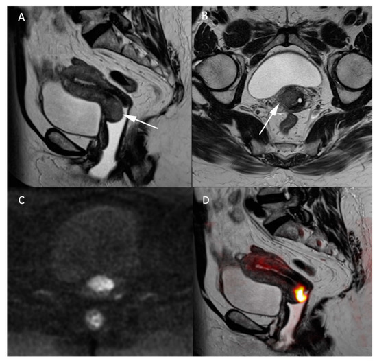 MR images of a 66-year-old woman with a known cervical carcinoma. (A) Sagittal T2W image; (B) axial T2W image perpendicular to the cervical axis. Cervical cancer and its extension appearing as low-contrasted T2W area (arrow) through the normal stroma and the right parametrium, (C) high b-value (b = 1000 s/mm2) and (D) fusion images between T2W and high b-value sequences for better evaluation of the carcinoma’s extension.