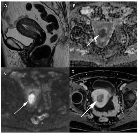 In addition to the morphologic T2W sequences, DWI is used to assess the local extension of the carcinoma and is equivalent to contrast-enhanced MRI [18]. The T2W axial oblique plane perpendicular to the long axis of the cervix is important in assessing parametrial invasion (stage IIB) and can be coregistered with the high b-value DW sequence to improve tumoral tissue delineation [19], as demonstrated in Figure 2. Cervical carcinomas are characterized by hypercellularity resulting in high signal intensity (SI) on high b-value (1000 s/mm2) DW images and a low Signal Intensity (SI) on the ADC map compared to normal cervical stroma [16]. So far, no ADC cutoff value has been validated to predict the presence of malignancy, mainly because of the mutual dependence between the calculated ADC value and the range of b-values used for calculation [16]. In the context of follow-up after local radiotherapy and systemic chemotherapy treatment, DWI is used to differentiate between residual disease and local fibrosis [20], as well as to detect tumor recurrence [21]. DWI may also be used as a biomarker for monitoring tumor response [22,23]. In a recent meta-analysis on the use of artificial intelligence (AI) in gynecologic tumors, cervical cancer was subject to a high number of studies (34 from 71) mainly focusing on the prognostic value of imaging [24]. As all MR sequences are exploited collectively in AI, it remains difficult to extrapolate on the specific utility of DWI within this kind of black box approach.