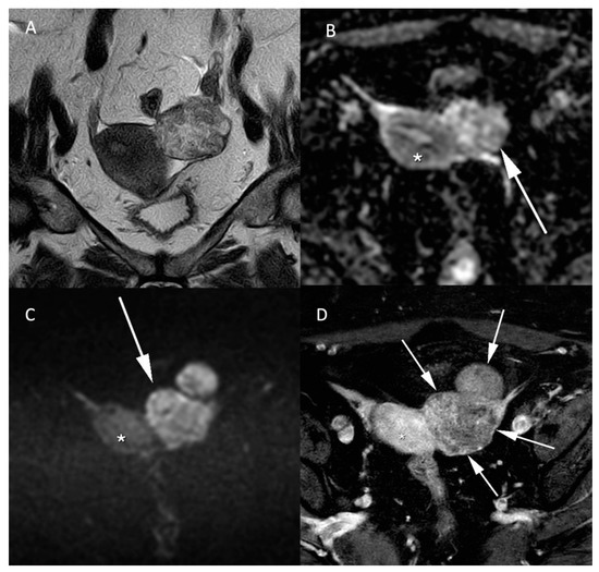 Leiomyosarcomas are rare malignant tumors of the uterus and account for less than 10% of uterine cancers. The differentiation between benign leiomyoma and leiomyosarcoma is essential for the surgical management of these lesions. MRI and especially DWI play an important role in the characterization and management of both tumors. In addition to morphologic specificities of leiomyosarcoma, such as the intermediate T2 signal, nodular borders, hemorrhagic components, “T2 dark” areas and central unenhanced areas [29], DWI-based parameters constitute another essential tool to differentiate benign leiomyoma from leiomyosarcoma. As shown in Figure 4, uterine leiomyosarcoma usually shows low ADC values and increased signal intensity on high b-value DW images compared to the normal myometrium [15]. In the meta-analysis of Virarkar et al. which included 795 patients from eight studies, ADC values were significantly lower in leiomyosarcomas than in leiomyomas [30]. In a recent case-control retrospective study, Wahab et al. proposed a diagnostic algorithm to differentiate leiomyomas from uterine sarcomas based on the presence of lymphadenopathy, higher SI on high b-value images in the mass relative to the endometrium and ADC values inferior to 0.905 × 10−3 mm2/s [31]. The respective sensitivity and specificity of this algorithm to classify the uterine masses were 97% and 99% in a training set of 156 patients, 88% and 100% in a first validation set of 42 patients and 83% and 97% in a second validation set of 59 patients. Focally or globally reduced T2W SI and DWI-based SI lower than the endometrium allows to confidently diagnose the mass as benign [31]. However, this promising approach needs further validation by prospective multicentric studies.