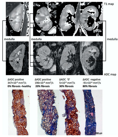 One of the most promising applications of DWI is the estimation of renal fibrosis in chronic kidney disease (CKD) patients, which is a key prognostic marker for renal function decrease and the progression of CKD. This assertion has two main arguments. First, ADC values correlate with renal function [118,119,120,121,122,123] and DWI is an accurate non-invasive imaging technique for the early diagnosis and staging of CKD, as shown by a meta-analysis [124]. Second, numerous clinical studies have directly demonstrated that cortical ADC values as well as other diffusion related parameters are linearly correlated to renal fibrosis in CKD patients, as assessed by renal biopsy [105,125,126,127,128,129,130,131,132,133]. As fibrosis increases, the cortical ADC values decrease much more than the medullary ADC values, resulting in an inversion of the cortico-medullary difference of ADC or so-called ΔADC which can be observed in the images [129] (see Figure 7). DWI can also differentiate between the different levels of fibrosis [127,128].