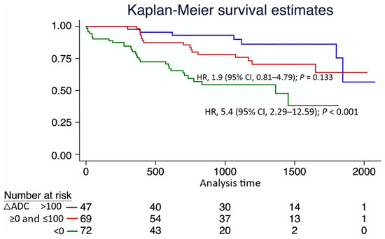 Another potential application of DWI in CKD is related to the prediction of its evolution. Recently, three independent research groups observed that baseline DWI was correlated to the decline of renal function [126,135,136]. In a study with 197 CKD patients, ΔADC prediction of the worst renal outcome as shown in Figure 8 was independent of baseline age, sex, eGFR and proteinuria, strongly suggesting that DWI could be an independent prognostic marker of CKD.
