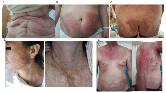 The clinical findings of patients with TIF-1γ DM are summarized in Table 2. Dyspnea on effort was not noted in patients with TIF-1γ DM but was noted in TIF-1γ-negative patients, demonstrating a significant difference (p < 0.005). Cutaneous manifestations (100%) and dysphagia (74%) were more frequently observed in TIF-1γ DM (both p-values were <0.001). During physical examinations, neither Raynaud’s phenomenon nor arthritis/arthralgia were observed in patients with TIF-1γ DM. The V-neck sign (57%, p < 0.001), erythema (64%, p < 0.001), heliotrope (64%, p = 0.020), and nailfold bleeding (p < 0.001) were frequently noted. Skin manifestations in patients with TIF-1γ DM were unusual compared with TIF1γnegative DM patients. Especially, characteristics of skin manifestation of TIF-1γ DM patients were widespread, more dark-red in color, and scattered throughout the body. They may manifest as an erythematous-violaceous rash (Figure 1a,b) or a crusted erosive lesion (Figure 1c). The V-neck sign is shown in Figure 1d, and erythema was more severe compared to that in patients with TIF-1γ-negative DM, its characteristics were spreading on the trunk and bilateral arms, and occasionally accompanied by dark pigmentation (Figure 1e).