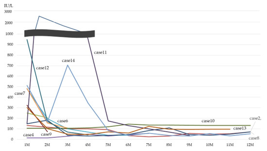 Figure 2 shows the follow-up data of CK level. All of the cases decreased the CK level after treatment.