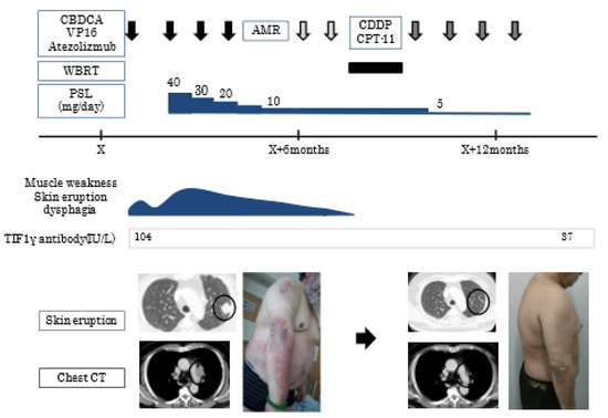 Case 13 showed the typical clinical course of TIF-1γ DM; the patient complained of muscle weakness, skin eruption, and dysphagia. (Figure 3) Lung nodules with lymphadenopathy were detected and diagnosed as small cell lung cancer. He was immediately treated with aggressive chemotherapy (carboplatin+ etoposide), but his symptoms temporally deteriorated. Consequently, PSL was started. His symptoms gradually improved with the effect of chemotherapy and PSL. Interestingly, primary lung cancer lesion and lymphadenopathy decreased in size, and the titer of TIF-1γ antibody also decreased after 3 months.