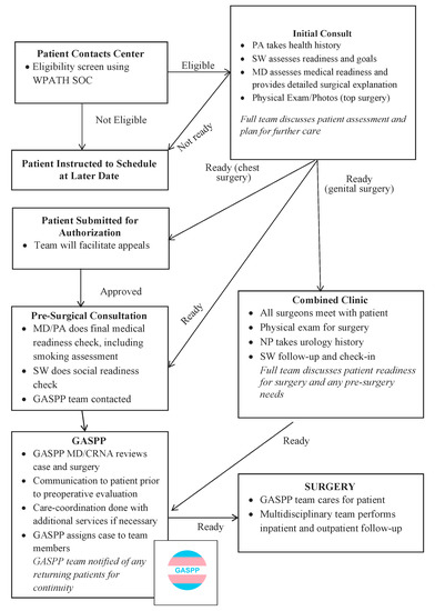 Center for Gender Surgery Patient Care Flow Chart for Chest and Genital Surgeries. WPATH SOC, World Professional Association of Transgender Health Standards of Care; PA, Physician Assistant; SW, Social Worker, MD, Medical Doctor; NP, Nurse Practitioner; CRNA: Certified Registered Nurse Anesthetist; GASPP, Gender Affirming Surgical Perioperative Program.