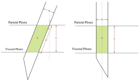 The volume occupied by the needle at an angle α (left), and the volume occupied by the needle as the needle hits the parietal pleura at a 90° angle (right). V: the volume occupied by the needle. H: the line formed by the needle going at an angle between the parietal pleura and the visceral pleura. h: the straight line between the parietal pleura and the visceral pleura. N: the diameter of the needle. α: the angle between the needle and a perpendicular line to the pleural membrane.