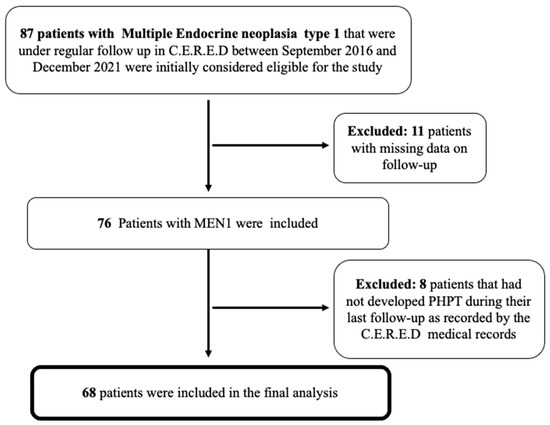 Flow chart of the finally included patients with MEN1-related PHPT that were under regular follow-up in our Centre (C.E.R.E.D). MEN1, Multiple Endocrine Neoplasia type 1; PHPT, primary hyperparathyroidism.