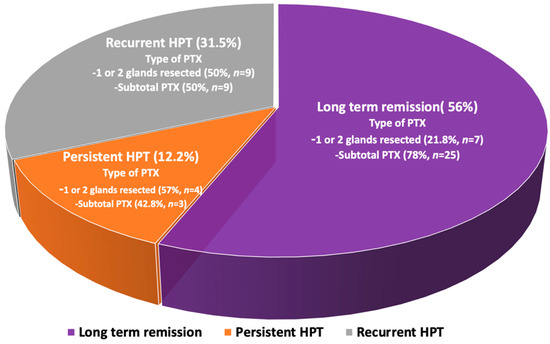 Long-term remission of PHPT was achieved in 32 patients (56%), persistent PHPT was reported in 7 (12.2%), and recurrent disease was found in 18 patients (31.5%) at a median follow-up of 4 years (ranging between 1 and 21 years) (Figure 2), while no incidence of laryngeal nerve damage was reported. Long-term remission was strongly associated with subtotal parathyroidectomy with an OR of 1.7 (95% CI: 1.2–3.7, p < 0.001), compared to surgical resection of only one or two parathyroid glands.