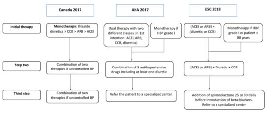 - Antza, C.; Doundoulakis, I.; Stabouli, S.; Kotsis, V. Comparison Among Recommendations for the Management of Arterial Hypertension Issued by Last US, Canadian, British and European Guidelines. High Blood Press. Cardiovasc. Prev. Off J Ital. Soc. Hypertens. 2018, 25, 9–16. [Google Scholar] [CrossRef]
