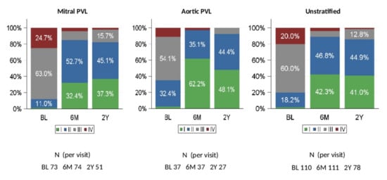 NYHA Class (relative frequencies) at baseline, 6 months, and 2 years (FAS). BL: baseline, 6M: 6 months; 2Y: 2 years. NYHA = New York Heart Association. PVL = paravalvular leak. FAS= full analysis set.