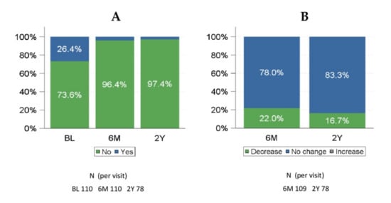 The statistical analysis comprised the safety and efficacy data of 137 SAF patients and efficacy data of 112 FAS patients. The FAS population was defined as patients with baseline and 180-day assessment and later. Follow-up data at 2 years was available in 80 FAS patients. Categorical variables are presented as numbers and percentages. Where appropriate, mean differences were compared using Student’s t-test for normally distributed variables. The Signed Wilcoxon test was used for non-normally distributed variables. Categorical variables were compared by Fisher’s exact test for 2 × 2 tables or by the sign test. For tables with more than 2 rows or columns, Pearson’s χ2 test was used. Two-sided p-values < 0.05 were considered statistically significant in all analyses. All calculations were carried out with SAS Version 9.4 (SAS Institute Inc., Cary, NC, USA).