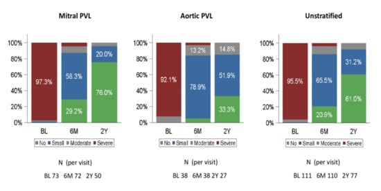 At baseline, 95.5% of patients in the FAS had severe regurgitation, while 86.4% of patients had no or small regurgitation at 180 days. There were 77 patients with PVL regurgitation grading at 2 years. Of them, 71 (92.2%) patients had no or small residual leak.