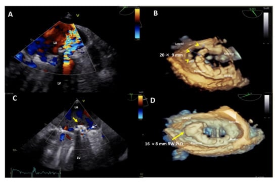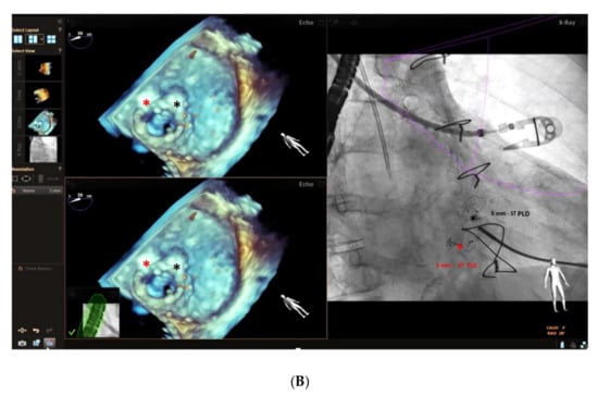 Furthermore, the use of multi-modality imaging such as fusion of real-time 3D TEE and cardiac fluoroscopy imaging has been shown to improve the safety and efficacy of percutaneous Mi and Ao PVL closure, facilitating catheter and guidewire access through the leaks by target markers [29] (Figure 7A,B; Supplementary Videos S1 and S2), reducing procedural time and radiation exposure.