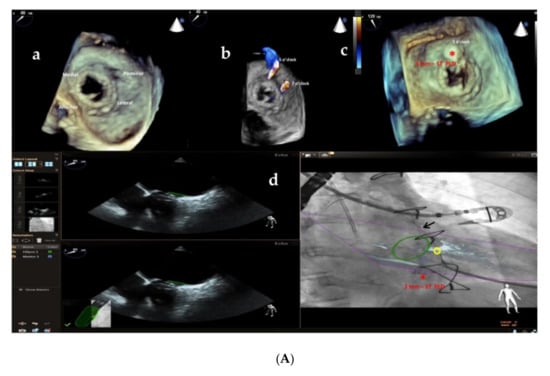 - Zorinas, A.; Janusauskas, V.; Davidavicius, G.; Puodziukaite, L.; Zakarkaite, D.; Kramena, R.; Cypiené, R.; Bilkis, V.; Rucinskas, K.; Aidietis, A.; et al. Fusion of real-time 3D transesophageal echocardiography and cardiac fluoroscopy imaging in transapical catheter-based mitral paravalvular leak closure. Adv. Interv. Cardiol. 2017, 13, 263–268. [Google Scholar] [CrossRef] [PubMed]