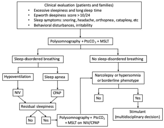 This article is the result of a long, close clinical and scientific collaboration between the National Reference Center for “Prader–Willi syndrome and rare obesities with eating disorders” (PRADORT) and the National Reference Center for Narcolepsy and Rare Hypersomnias in Pitié-Salpêtrière hospital (Sorbonne University), Paris, France. Comprehensive research of electronic literature on the PubMed/MEDLINE and Embase databases was conducted to find relevant, English-language published articles. The following medical subject headings (MeSH terms and not) were used: “sleepiness”, “excessive daytime sleepiness”, “sleep disorders”, “sleep abnormalities”, “sleep disturbances”, “sleep-related disorders”, “polysomnography”, “sleep study”, “insomnia”, “hypersomnia”, “narcolepsy”, “sleep-onset REM”, “cataplexy”, “orexin-A”, “hypocretin-1”, “modafinil”, “melatonin”, “circadian system”, “circadian rhythm”, “parasomnia”, “rhythm disorders”, “central apnea”, “obstructive apnea”, “ sleep apnea”, “sleep hypoventilation”, “sleep hypoxemia”, “hypoventilation”, “breathing sleep disordered”, “non-invasive ventilation”, “continuous positive airway pressure” [AND] “Prader-Willi syndrome”. The most relevant studies were selected by a group of expert neurologists and pulmonologists if at least one of the following topics was covered: (i) the main sleep-related symptom including sleepiness or excessive daytime sleepiness, detailing clinical examination, and questioning of patients and caregivers and the main tools for assessing sleep disorders; (ii) the SDB and its treatment, and (iii) the diagnosis and treatment of central disorders of hypersomnolence. The vastness and complexity of the subject led us to conduct a narrative review. This choice was also made on account of the great diversity of study designs in the published articles, including numerous case reports and multiple case series with a small number of patients.