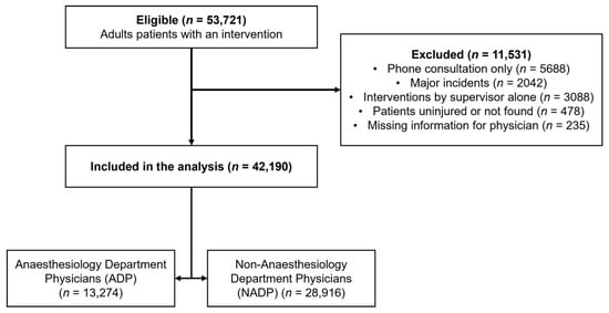 Between January 2008 and December 2018, 53,721 files were filled for interventions for adults (Figure 1). We excluded 11,531 interventions, mainly because they were only phone consultations for paramedics, or were performed by a supervisor alone. Of the remaining 42,190 interventions, 13,274 (31.5%) were performed by ADPs and 28,916 (68.5%) by NADPs. Male physicians performed 24,073 interventions (57.1%), with a higher proportion in the NADP group than in the ADP group (59.6 vs. 51.5%, p < 0.001).