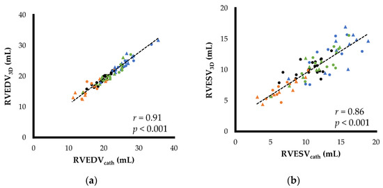 Although RVEDA and RVIDd were significantly associated with RVEDVcath, the correlations were lower than those with RVEDV3D in this study (RVEDA, r = 0.48, p < 0.001; RVIDd, r = 0.37, p < 0.001). Additionally, RVESA showed an intermediate correlation with RVESV (r = 0.62, p < 0.001), although a strong correlation was observed between RVESV3D and RVESVcath.