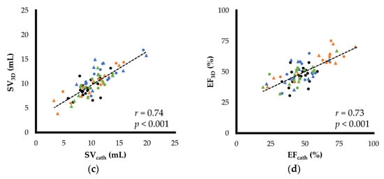 Correlations between the right ventricular morphology and function measured by right heart catheterization and real-time three-dimensional echocardiography: (a) end-diastolic right ventricular volume (RVEDV); (b) end-systolic right ventricular volume (RVESV); (c) stroke volume (SV); (d) ejection fraction (EF). Black round dots show the measurements of baseline. Orange round and triangular dots show the measurements of 5 and 10 µg/kg/min dobutamine infusions, respectively. Blue round and triangular dots show the measurements of 15 and 30 min after acute volume load, respectively. Green round and triangular dots show the measurements of 15 and 30 min after furosemide administration, respectively.