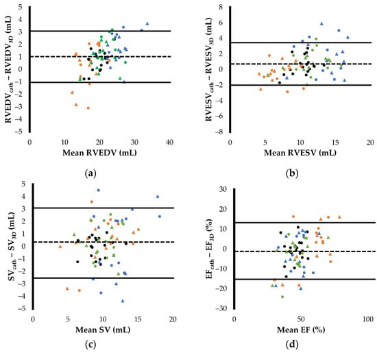 Agreements between the right ventricular morphology and function measured by right heart catheterization and real-time three-dimensional echocardiography demonstrated on Bland–Altman plots: (a) end-diastolic right ventricular volume (RVEDV); (b) end-systolic right ventricular volume (RVESV); (c) stroke volume (SV); (d) ejection fraction (EF). The horizontal solid and dotted lines represent the mean difference and the limits of agreement, respectively. Black round dots show the measurements of baseline. Orange round and triangular dots show the measurements of 5 and 10 µg/kg/min dobutamine infusions, respectively. Blue round and triangular dots show the measurements of 15 and 30 min after acute volume load, respectively. Green round and triangular dots show the measurements of 15 and 30 min after furosemide administration, respectively.