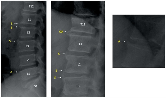 Examples of syndesmophytes and ambiguous lesions. S indicates syndesmophytes and A indicates ambiguous lesions; OA indicates osteophyte. T12 indicates 12th thoracic vertebra and L1/L2/L3/L4/L5 indicate 1st, 2nd, 3rd, 4th, 5th lumbar vertebrae respectively and S1 indicates 1st sacral vertebra.