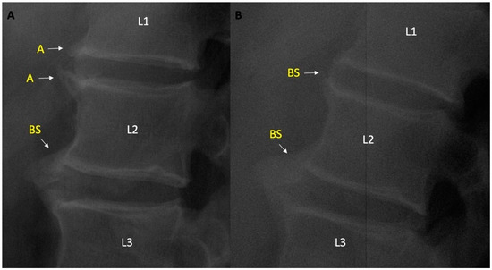 Lesions that cannot be distinguished from syndesmophytes and osteophytes on lumbar (lateral and AP) radiographs are called ambiguous lesions (Figure 1).