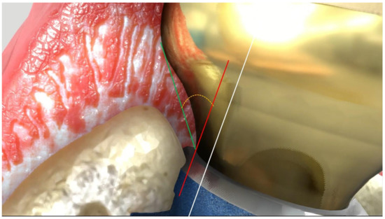 Emergence angle (EA) definition. White line: parallel to implant long axis. Red line: parallel to the white and tangential to the restoration from the implant to abutment connection. Green line: from implant to abutment connection point to the emergence profile. The angle of the intersection (yellow line) resulted in the emergence angle (EA).