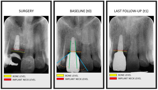 Bone levels at time of implant surgery, at prosthesis installation (baseline) and at last follow-up visit. Green line: implant axis. Blue line: prosthetic emergence profile axis. Orange line: angle between implant axis and prosthetic emergence profile ≤30°, determining the allocation in Group 2.