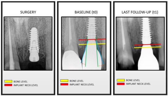 Radiographic images were then analyzed with a software program (Image J, NIH, Montgomery County, MD, USA) to measure the following parameter: peri-implant bone level (marginal bone level, MBL). Measurements were made at the mesial and distal aspects of each implant and were reported in millimeters.