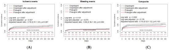 Kaplan–Meier survival curves showing the efficacy endpoint (ischemic events, (A)), safety endpoint (bleeding events, (B)), and composite endpoint (composite of ischemic and bleeding events, (C)) before and after adjustment using the inverse propensity of treatment weights.