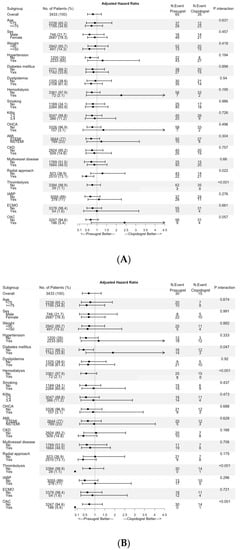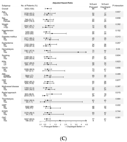 Table 3 shows the in-hospital mortality and unadjusted ischemic and bleeding events. Most of the events had a greater prevalence in the clopidogrel group than in the prasugrel group. The cumulative incidence rate of ischemic events, BARC type 3 or 5 bleeding, and composite events, which were unadjusted and adjusted by IPWT, is shown in Figure 1A–C. Ischemic events and composite events were significantly more frequent in the clopidogrel group than in the prasugrel group before adjustment (p = 0.007, p = 0.002, respectively), while bleeding events were comparable between the groups (p = 0.131). All differences became non-significant after adjustment by IPWT. The results of the subgroup analyses are shown in Figure 2A–C. Significant interactions were observed in the radial approach and hemodialysis for composite events.